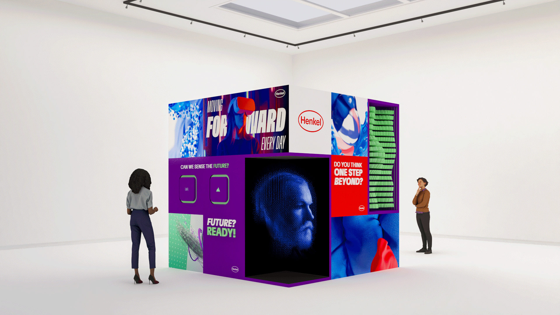 Each cube featured interactive focal points designed to engage all senses, including touch-enabled LED panels, sensorial surfaces, interactive tokens, and kinetic installations. The exhibition invited visitors to actively explore Henkel’s future-ready vision through play, movement, and discovery.